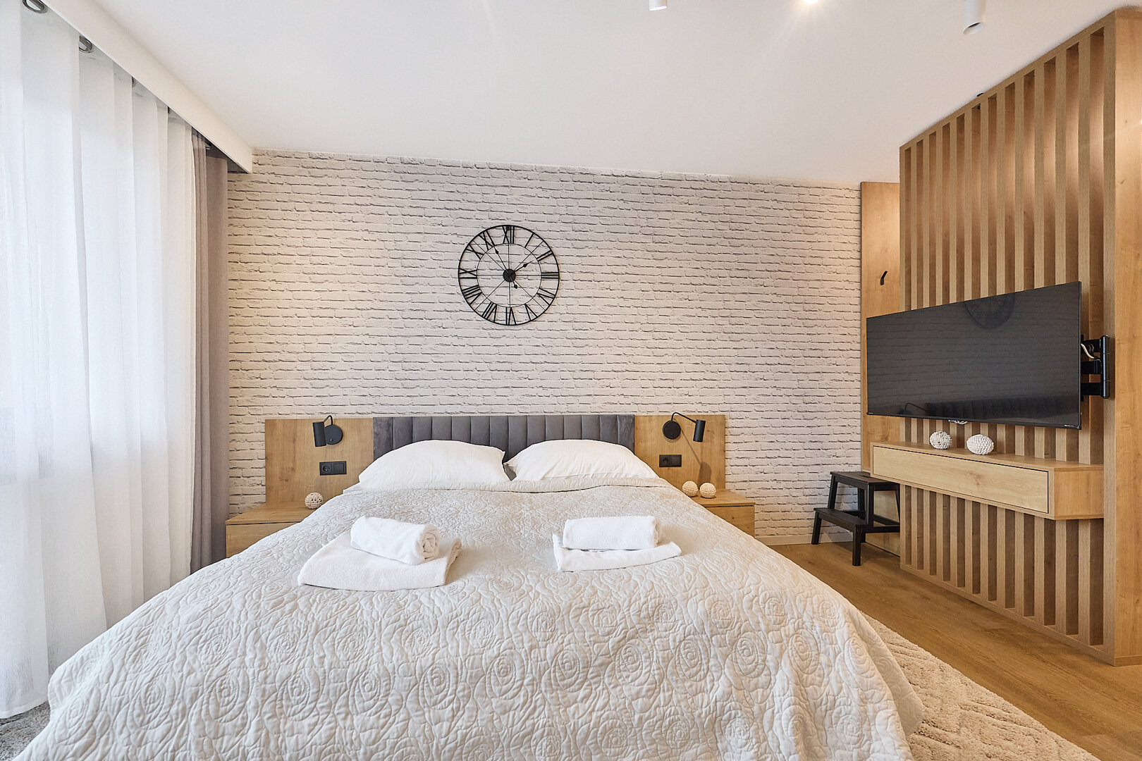 Das Apartment wurde in einem hellen, skandinavischen Stil gestaltet, der Funktionalität mit Eleganz verbindet. Der Wohnbereich verfügt über ein bequemes Queensize-Bett, das nach einem langen Tag für erholsamen Schlaf sorgt. Darüber hinaus stehen den Gästen ein Schlafsofa sowie ein Essbereich mit rundem Tisch und stilvollen Stühlen zur Verfügung.