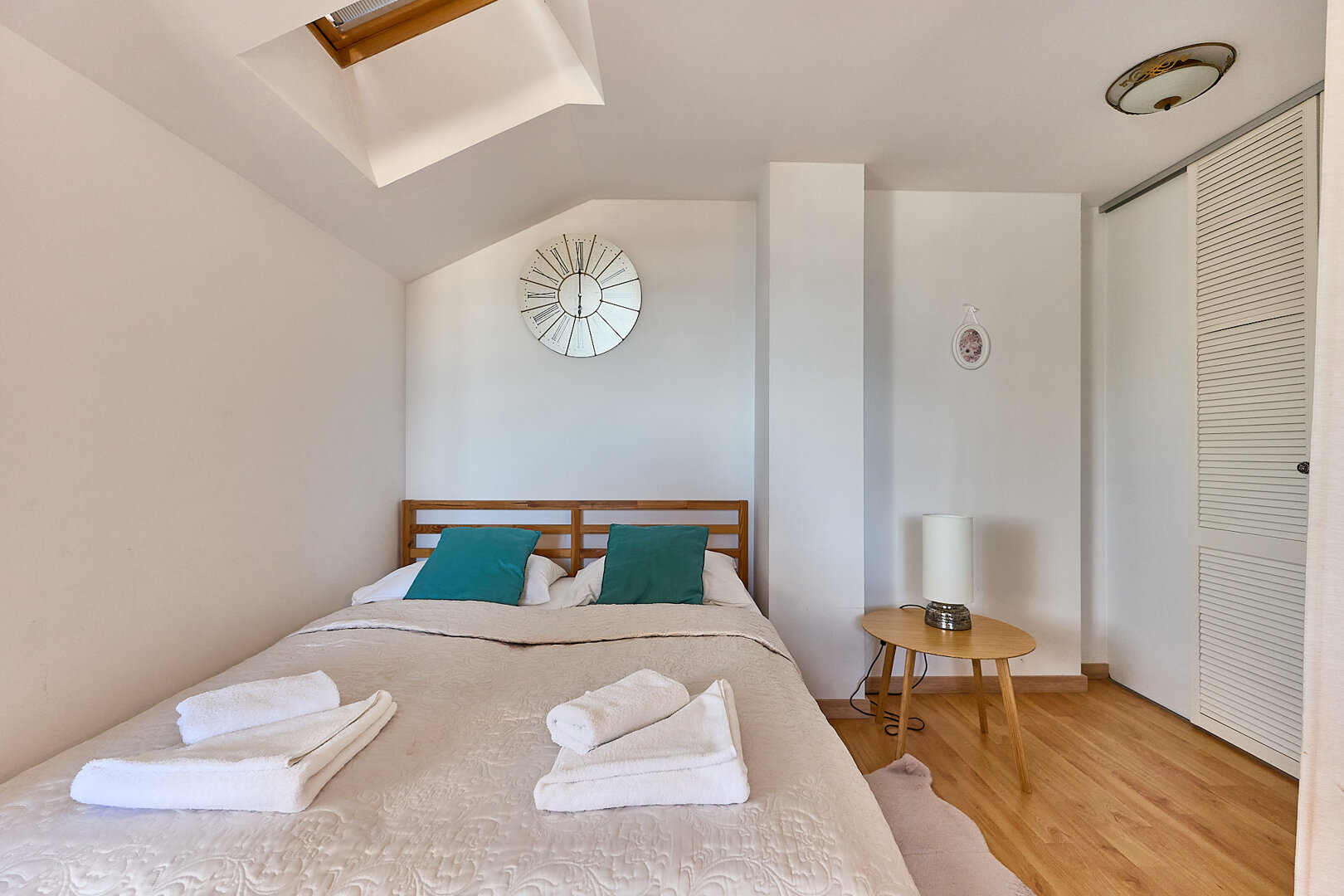On the lower level, there is a living room with a kitchenette and a bathroom, and on the upper level, there is a bedroom and a wardrobe.