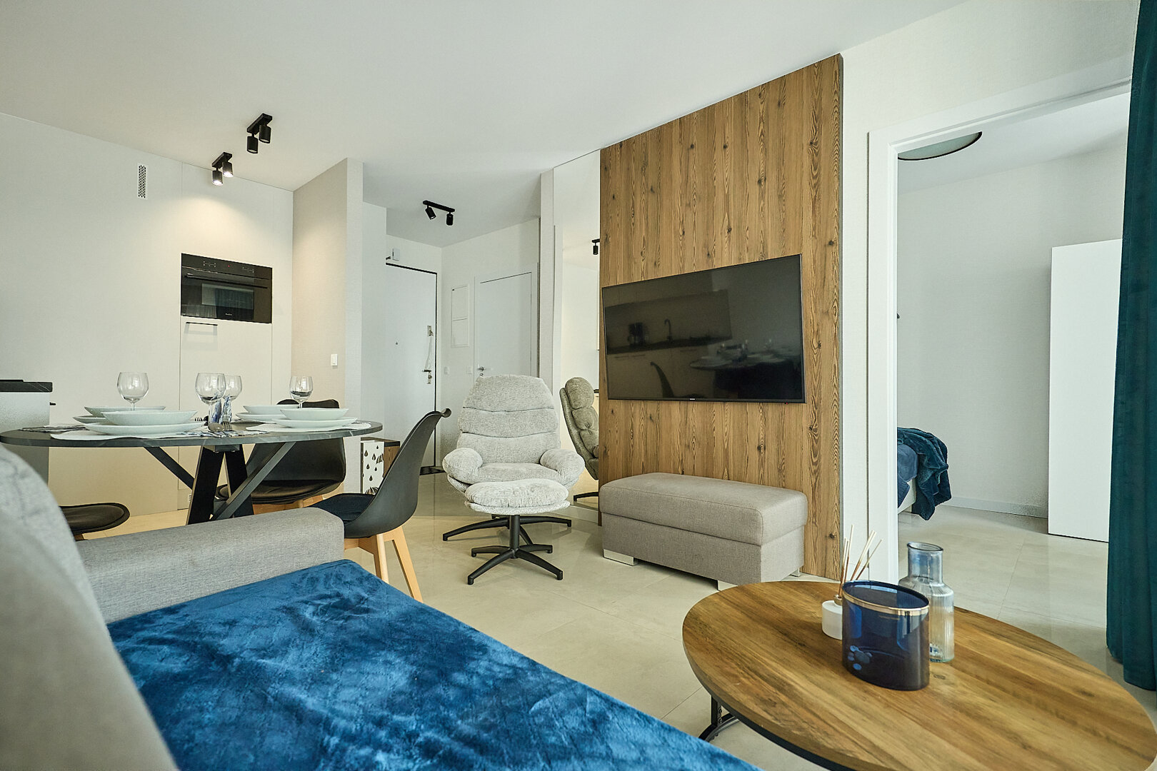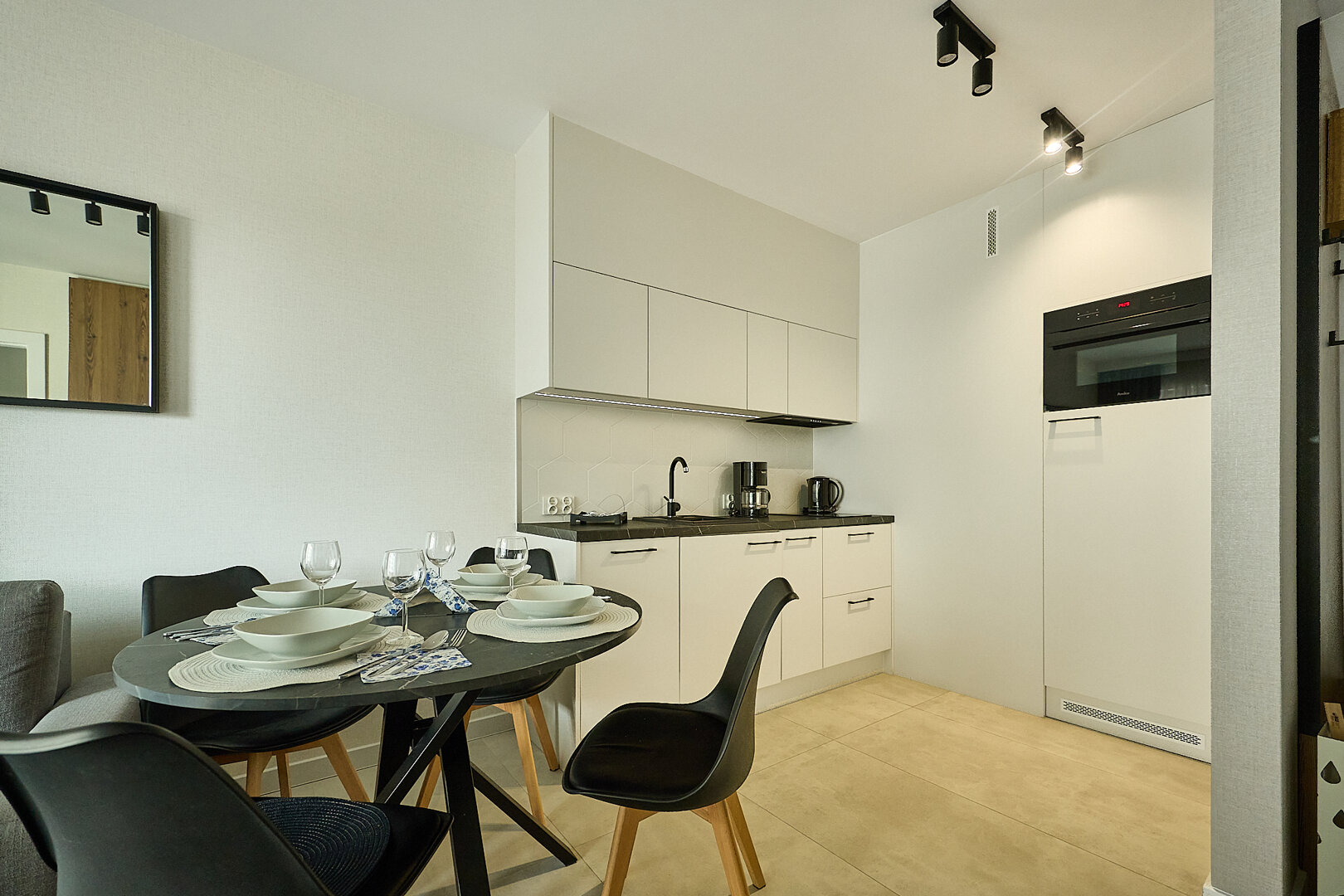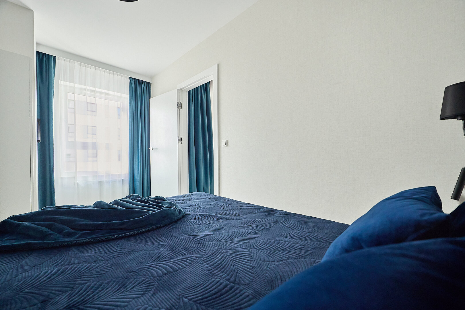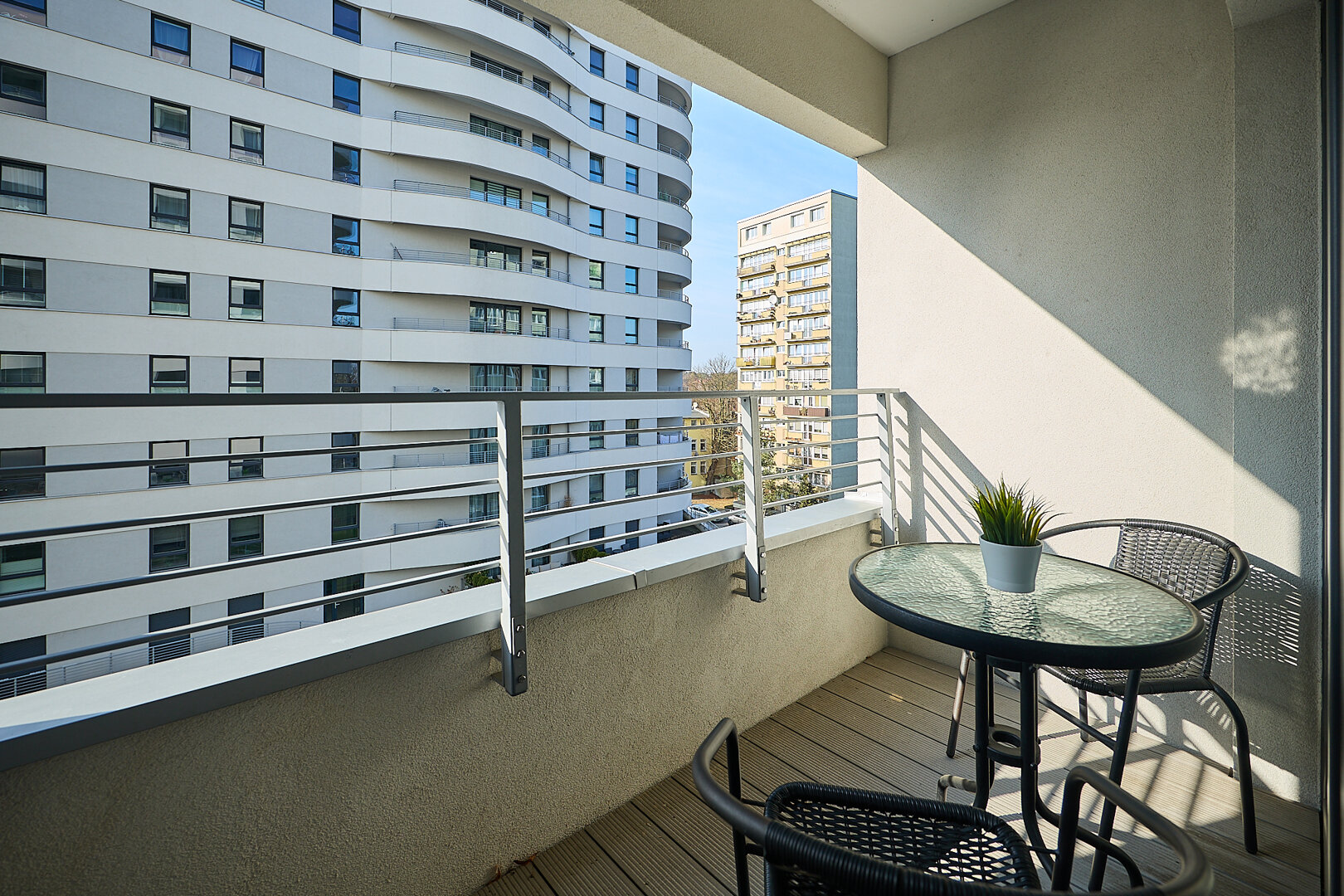 Przytulny apartament dwupokojowy, położony na 4. piętrze z balkonem od strony zachodniej. Składa się z pokoju dziennego, połączonego z aneksem kuchennym oraz sypialni i łazienki. Przestrzeń pokoju dziennego wypełnia wygodna, rozkładana dwuosobowa kanapa, stolik kawowy, fotel oraz telewizor. Aneks kuchenny wyposażony został w płytę elektryczną 2palnikową, zmywarkę, lodówkę czajnik elektryczny, ekspres do kawy i toster. W apartamencie jest również stół i krzesła. W sypialni znajduje się łóżko małżeńskie. Balkon wychodzi na stronę zachodnią. Do apartamentu przynależy miejsce parkingowe naziemne. W całym apartamencie można korzystać z wi-fi.