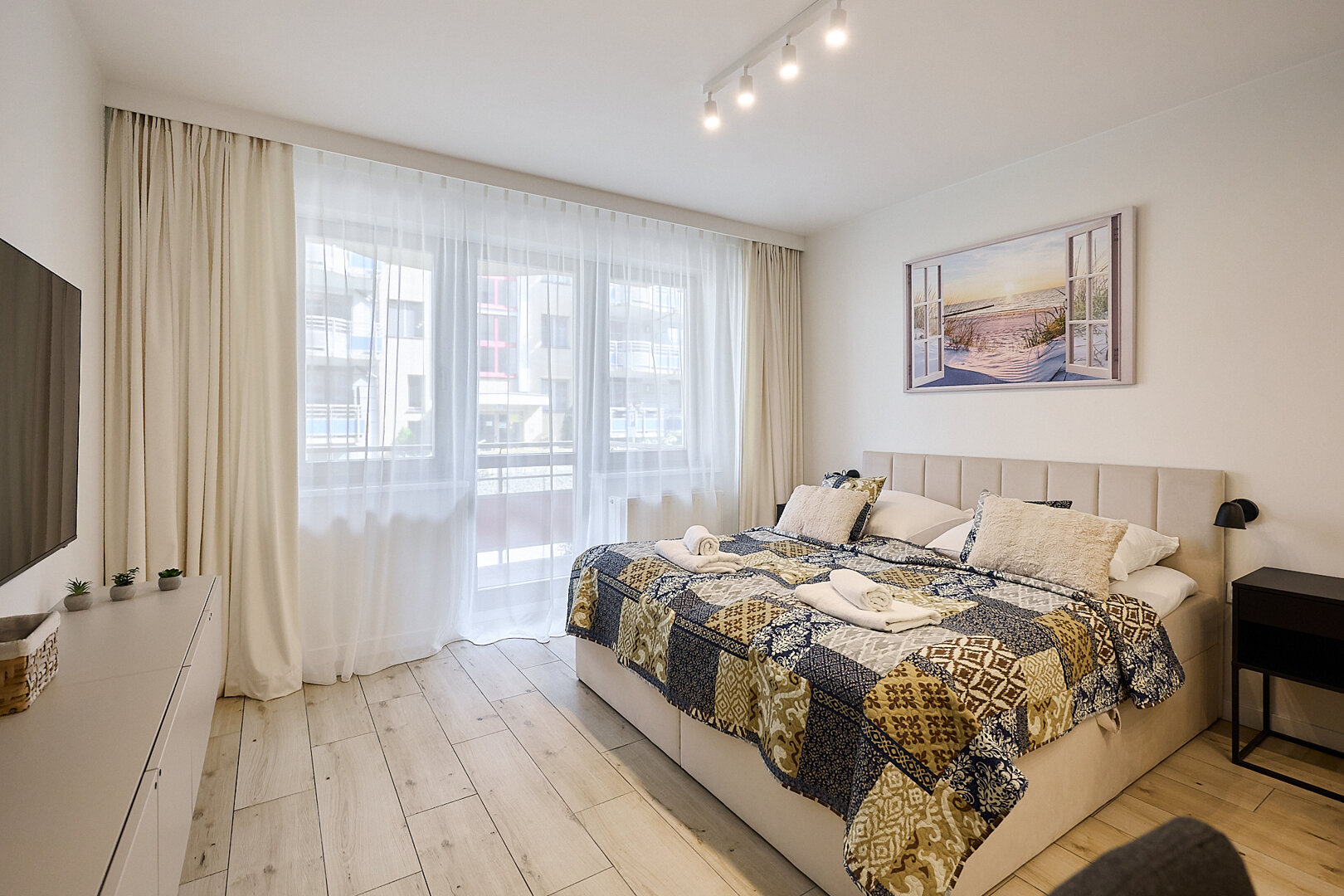Wnętrze jest dobrze doświetlone dzięki dużym oknom z wyjściem na balkon, a zasłony zapewniają prywatność i przytulną atmosferę. Nowoczesne oświetlenie oraz starannie dobrane dodatki tworzą wyjątkowy klimat.