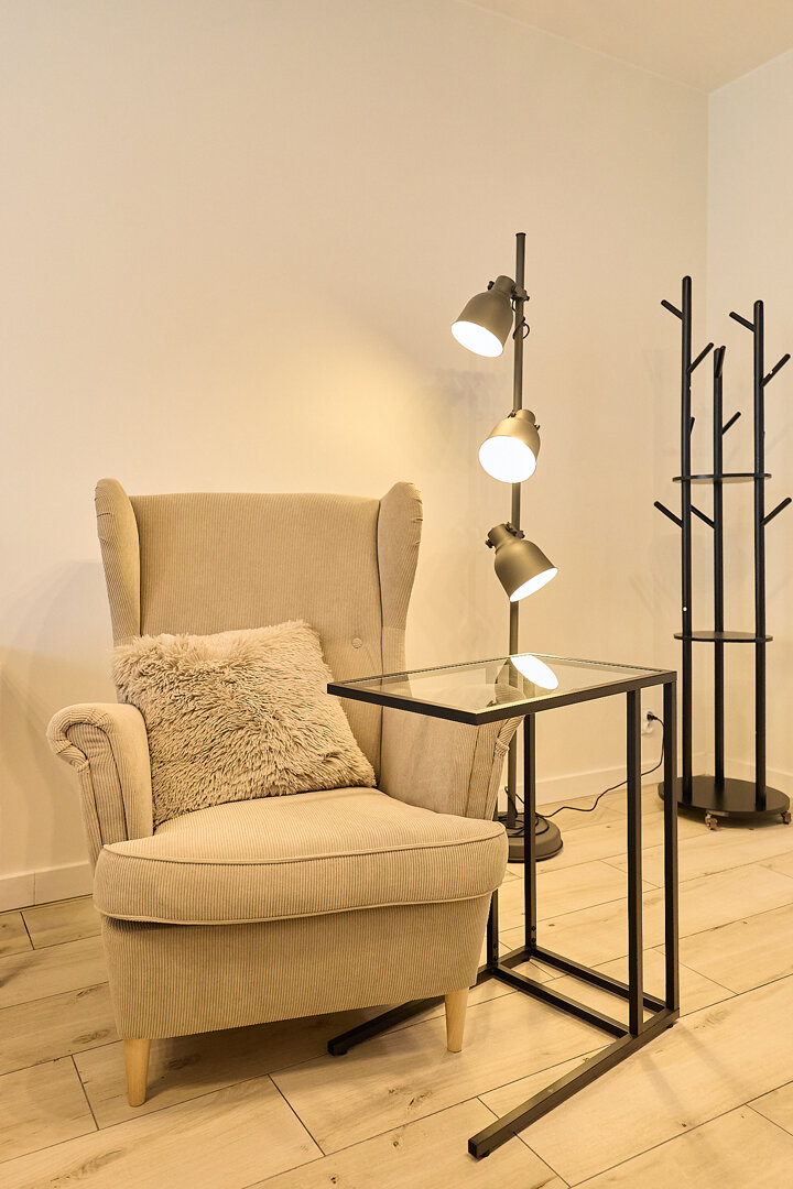 Apartament został zaprojektowany w jasnym stylu, który łączy funkcjonalność z elegancją. Przestrzeń dzienna obejmuje wygodne łóżko typu queen size, zapewniające komfortowy wypoczynek po całym dniu. Dodatkowo do dyspozycji gości jest strefa jadalniana ze stylowymi krzesłami, oraz kącik do czytania z wygodnym fotelem.